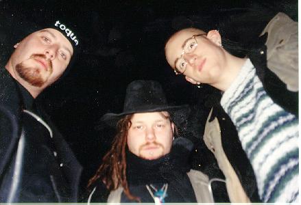Left to right: Half-Mad, The Hellhound >101<, Floyd Gecko. It should be noted that the Hellhound >101< is NOT a dwarf. In fact, he is about 6' tall. However, in this photo, his legs have been temporarily removed to the Mauve Room to commune with Cthulhu, causing him to appear stunted. Two seconds after this photo was taken, the legs returned, and Half-Mad's head exploded due to psychic vibrations from the astral plane caused by their re-entry into real space.